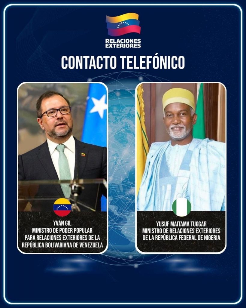 El canciller de la República Bolivariana de Venezuela, Yván Gil, informó que el Gobierno venezolano ha recibido un firme mensaje de apoyo por parte del Ministro de Asuntos Exteriores de Nigeria, Yusuf Tuggar, en rechazo a los recientes ataques militares del Gobierno de Estados Unidos contra Venezuela.