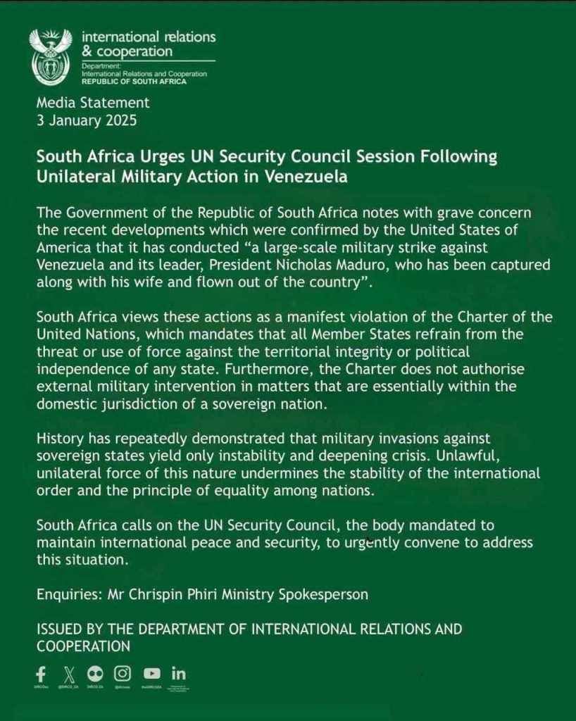El Gobierno Bolivariano de Venezuela, en nombre de su pueblo, expresa su más profundo agradecimiento a la República de Sudáfrica por su rápida y decidida convocatoria a una sesión urgente del Consejo de Seguridad de las Naciones Unidas, en respuesta a la acción militar unilateral de los Estados Unidos contra Venezuela, la cual constituye una violación flagrante de los principios consagrados en la Carta de la ONU.