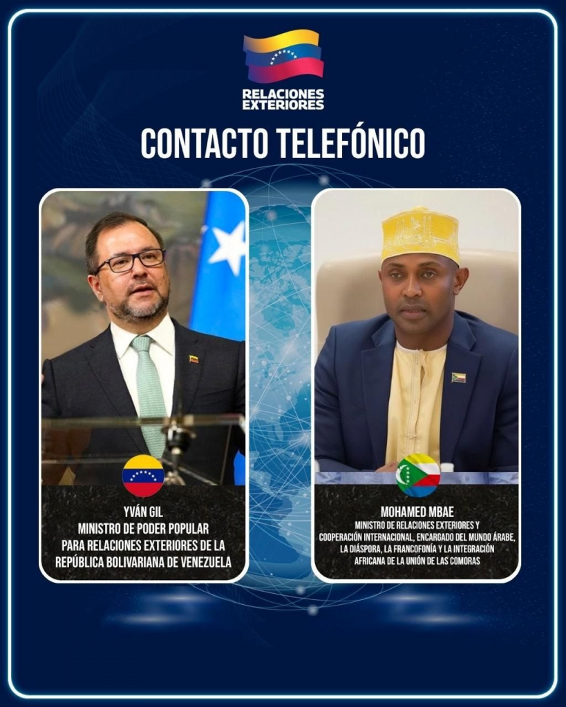 El canciller de la República Bolivariana de Venezuela, Yván Gil, sostuvo una conversación con su homólogo de la Unión de las Comoras, Mbae Mohamed, ministro de Asuntos Exteriores y Cooperación Internacional, quien también tiene bajo su responsabilidad las áreas del Mundo Árabe, la Diáspora, la Francofonía y la Integración Africana.