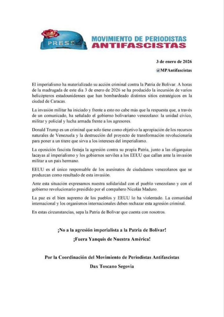 Por otra parte, el Movimiento de Periodistas Antifascistas emitió un comunicado rechazando la acción militar que ha llevado a cabo Estados Unidos, indicando que «el imperialismo ha materializado su acción criminal contra la Patria de Bolívar». Asimismo, la misiva señala que horas de la madrugada se ha producido la incursión de varios helicópteros estadounidenses que han bombardeado distintos sitios estratégicos en la ciudad de Caracas.