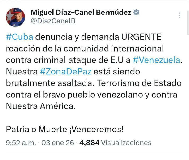 Por su parte, el presidente de Cuba, Miguel Diaz-Canel, denunció y repudió a través de sus redes sociales el ataque criminal de los Estados Unidos contra la nación venezolana.