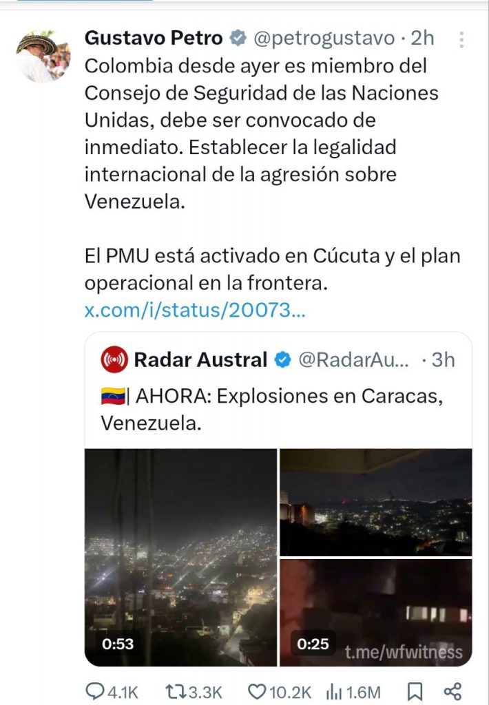 Entre las reacciones internacionales condenando los ataques a Venezuela se encuentran: El presidente de Colombia, Gustavo Petro, quien exigió una reacción internacional urgente, llamó a convocar el Consejo de Seguridad de las Naciones Unidas después de que la madrugada de este sábado se hayan registrado fuertes explosiones en varias locaciones de Venezuela. «Colombia desde ayer es miembro del Consejo de Seguridad de las Naciones Unidas, debe ser convocado de inmediato. Establecer la legalidad internacional de la agresión sobre Venezuela. El PMU [Puesto de Mando Unificado] está activado en Cúcuta y el plan operacional en la frontera», escribió Petro en su cuenta de X.