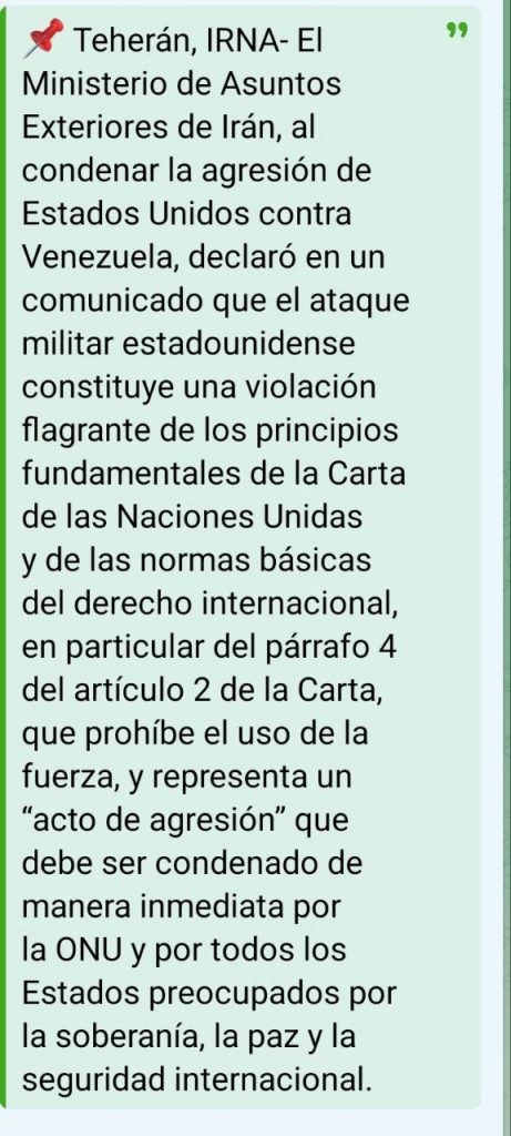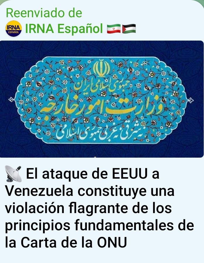 Al mismo tiempo, el Ministerio de Asuntos Exteriores de Irán se ha sumado al respaldo internacional hacia Venezuela mediante un comunicado oficial emitido por la agencia IRNA. Los puntos clave de su declaración incluyen: