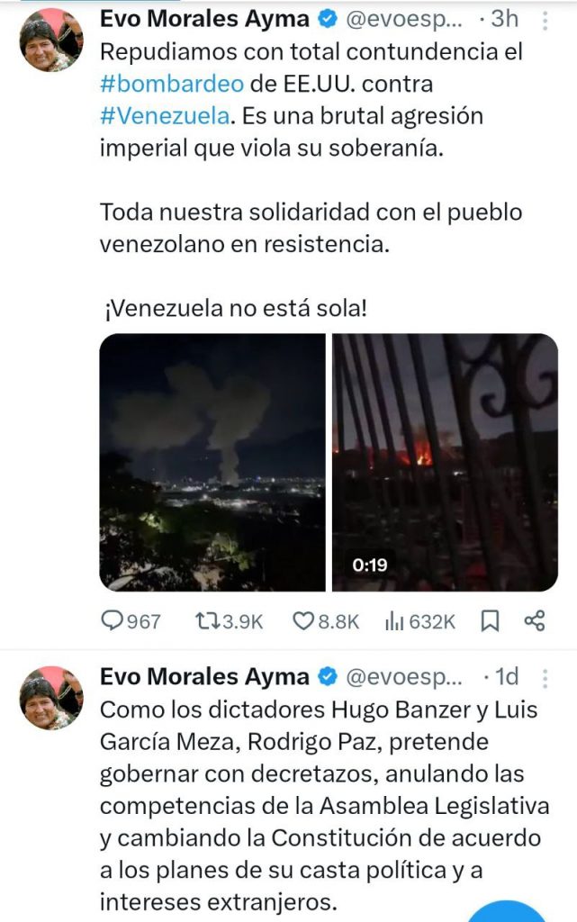 También el expresidente de Bolivia, Evo Morales, condenó enérgicamente este sábado los ataques aéreos de EEUU contra Venezuela. «Repudiamos con total contundencia el bombardeo de EEUU contra Venezuela. Es una brutal agresión imperial que viola su soberanía», declaró a través de su cuenta en X. «Toda nuestra solidaridad con el pueblo venezolano en resistencia. ¡Venezuela no está sola!», escribió el exmandatario de Bolivia.