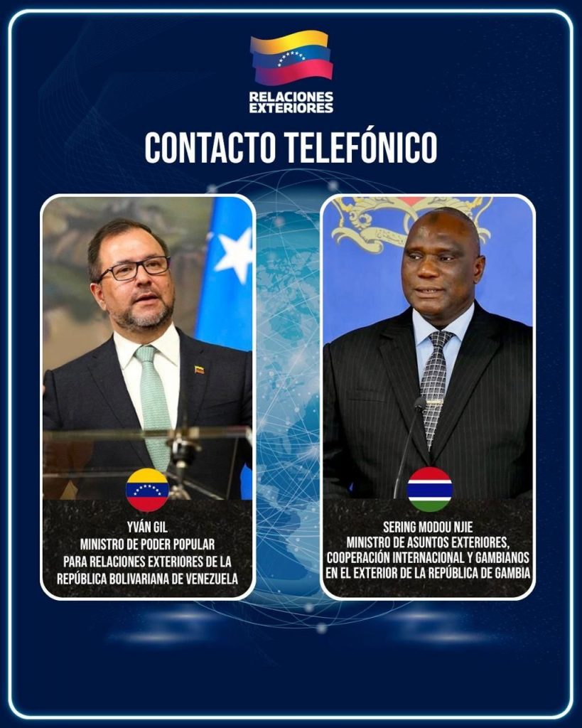 Yván Gil, ministro de Relaciones Exteriores de Venezuela, informó que se continua difundiendo la verdad sobre Venezuela. «Hemos dialogado con Sering Modou Njie, Ministro de Asuntos Exteriores, Cooperación Internacional y Gambianos en el Exterior de la República de Gambia, acerca de la valiente resistencia del pueblo venezolano frente a la agresión imperialista de Estados Unidos». Reiteramos nuestro compromiso conjunto con el respeto al derecho internacional, sin excepciones.