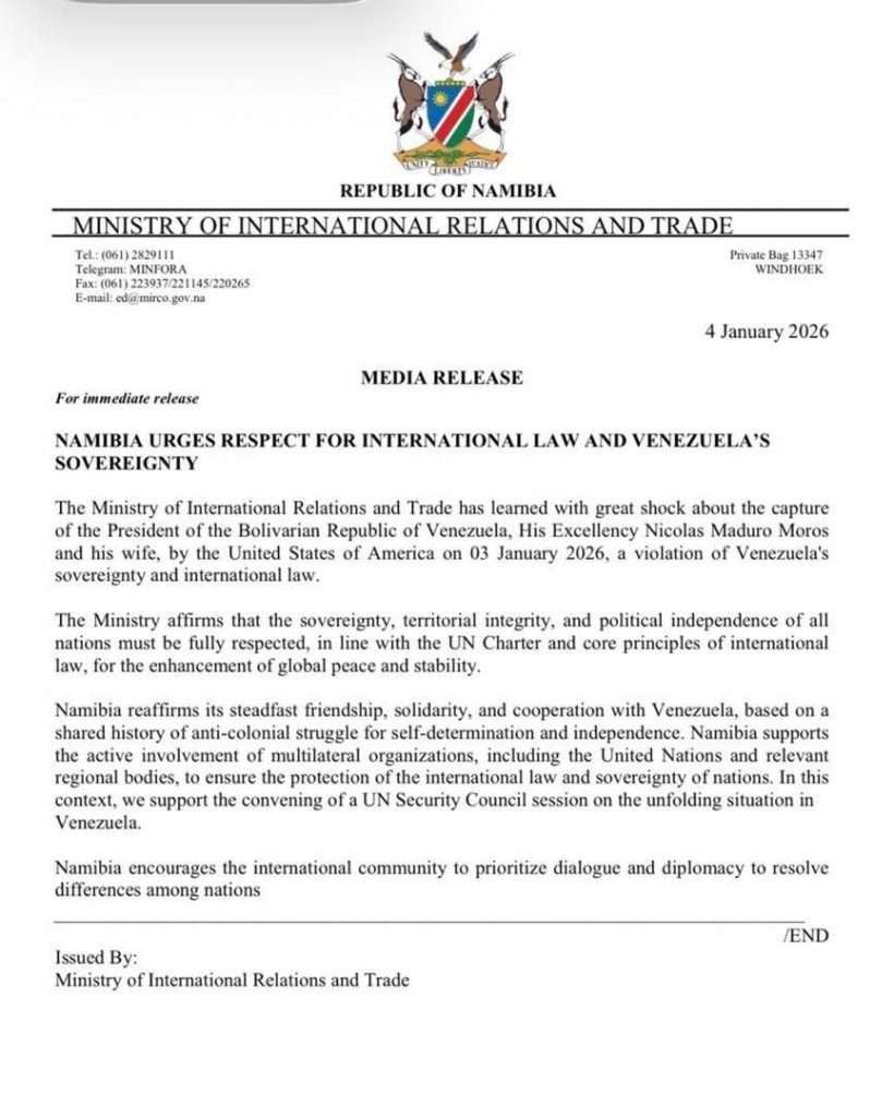 En esta ocasión, el gobierno Bolivariano agradece profundamente el pronunciamiento de la cancillería de la República de Namibia que condena la agresión a nuestra soberanía y el secuestro del presidente Nicolás Maduro Moros. Venezuela y Namibia mantienen una profunda amistad basada en la amistad, la cooperación y la convicción en la defensa de la independencia y la soberanía de las naciones.