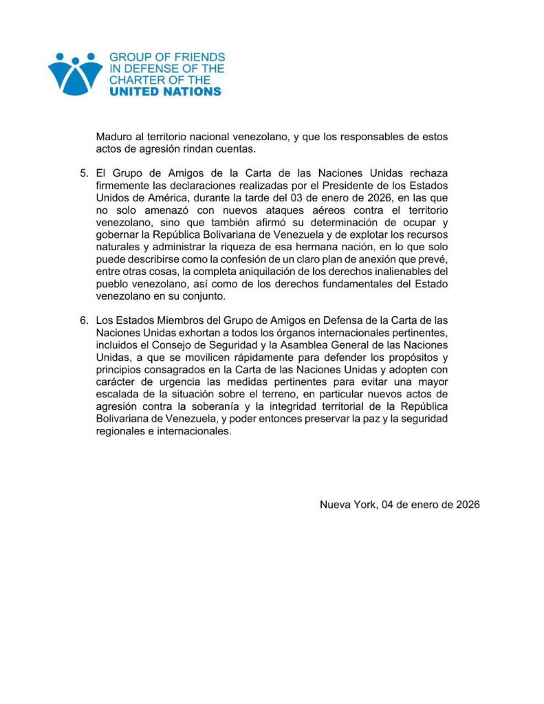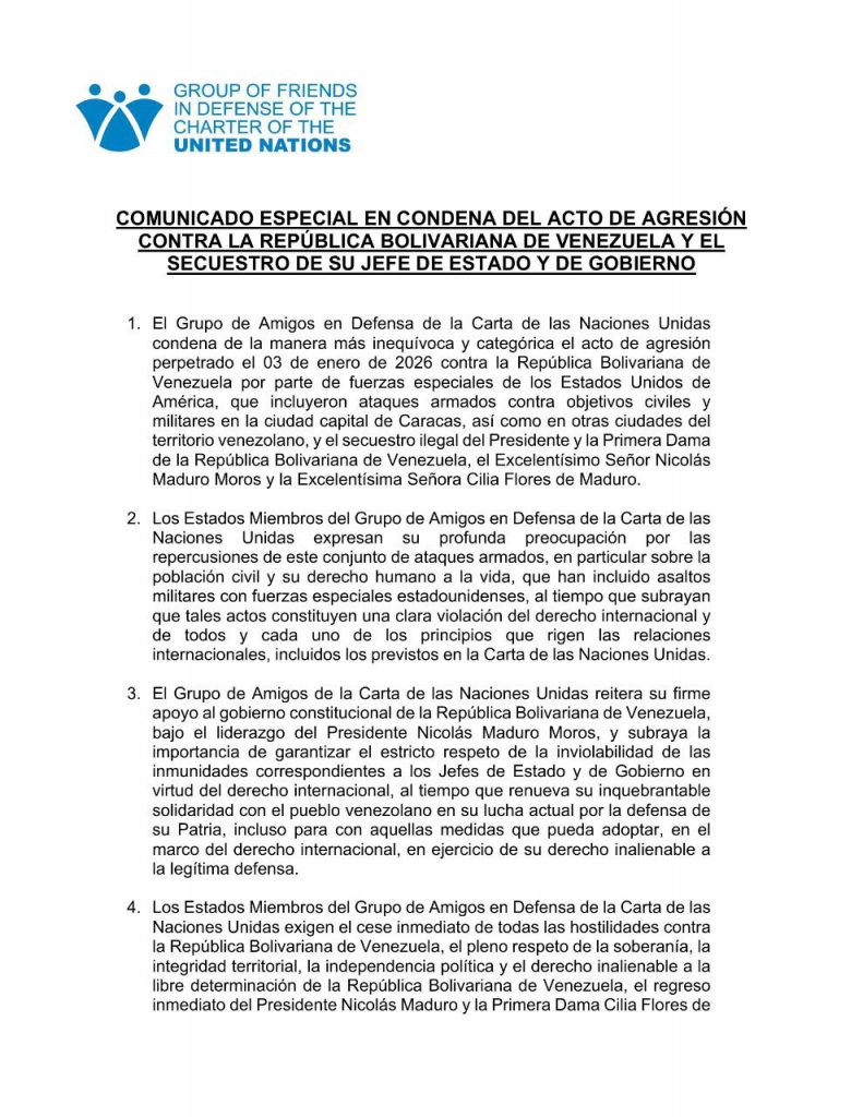 Entre tanto, el Grupo de Amigos en Defensa de la Carta de las Naciones Unidas condena de la manera más inequívoca y categórica el acto de agresión perpetrado el 03 de enero de 2026 contra la República Bolivariana de Venezuela por parte de fuerzas especiales de los Estados Unidos de América, que incluyeron ataques armados contra objetivos civiles y militares en la ciudad capital de Caracas, así como en otras ciudades del territorio venezolano, y el secuestro ilegal del Presidente y la Primera combatiente de la República Bolivariana de Venezuela, el Excelentísimo Señor Nicolás Maduro Moros y la Excelentísima Señora Cilia Flores de Maduro.