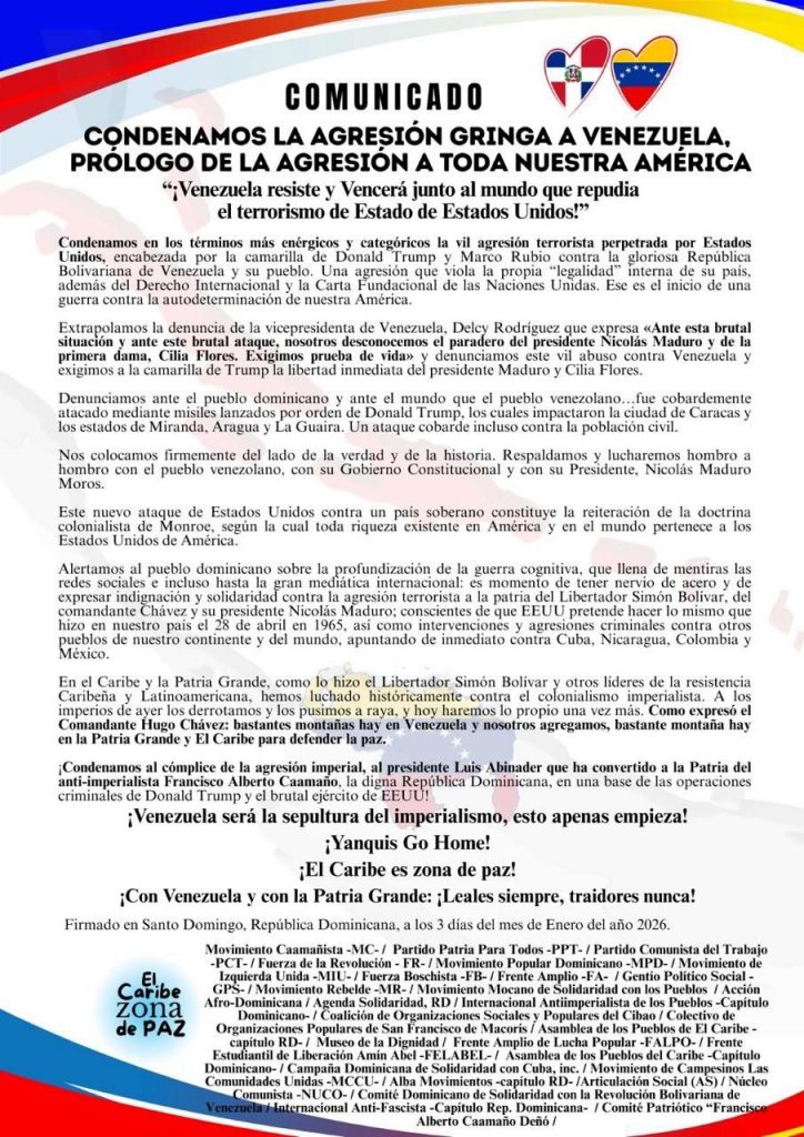 También organizaciones y movimientos populares y sociales de la República Dominicana han emitido un comunicado firme en rechazo al ataque terrorista perpetrado por Estados Unidos, así como al secuestro del presidente Nicolás Maduro y la Primera Combatiente, Cilia Flores. Rescatamos y reafirmamos el mensaje final del comunicado: «Venezuela será la sepultura del imperialismo».