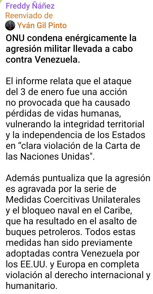 Caracas, 7 de enero de 2026: Las Naciones Unidas han emitido una condena enérgica ante la reciente agresión militar ejecutada contra Venezuela, calificándola como una violación flagrante de la soberanía nacional y de los principios fundamentales establecidos en la Carta de las Naciones Unidas.