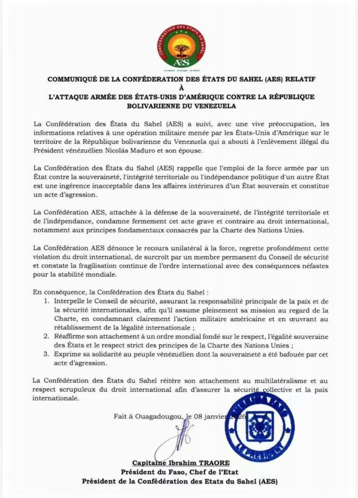 Caracas, 8 de enero de 2026: La Confederación de Estados del Sahel (AES) ha emitido un comunicado oficial expresando su «viva preocupación» y una firme condena ante lo que califican como una operación militar de los Estados Unidos en territorio venezolano.