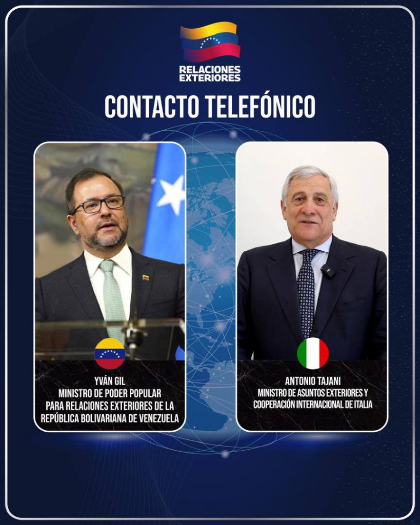 «He sostenido una conversación con el Ministro de Asuntos Exteriores y Cooperación Internacional de Italia, Antonio Tajani, en la que expuse los recientes ataques contra Venezuela, que ocasionaron centenares de fallecidos entre civiles y militares, en abierta violación del derecho internacional y de la Carta de las Naciones Unidas. Le expresé también la profunda valoración que tiene el pueblo venezolano y la comunidad inmigrante italiana que vive en Venezuela por los lazos históricos y culturales que nos unen», manifestó el ministro Yván Gil.