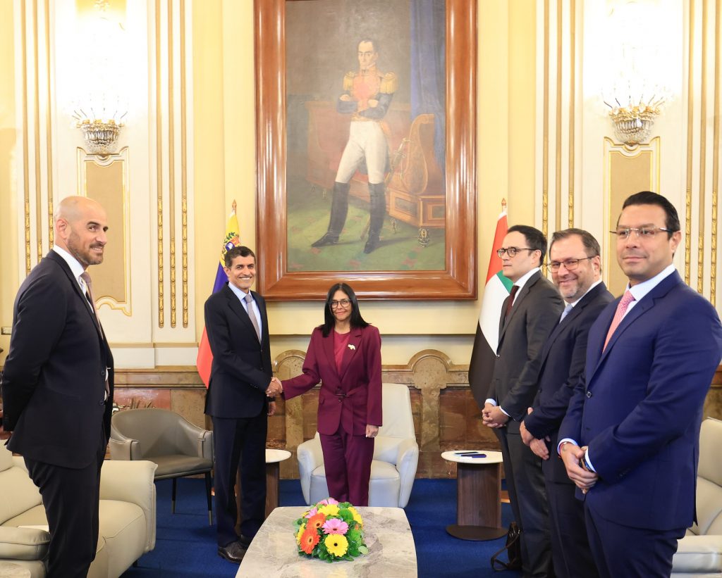 Caracas, 13 de enero de 2026.– La presidenta encargada de la República Bolivariana de Venezuela, Delcy Rodríguez, se reunió este martes con el enviado especial del presidente de los Emiratos Árabes Unidos, Su Excelencia Ali Mohammed Hammad Al Shamsi, en el Palacio de Miraflores, en Caracas. Este encuentro forma parte de la agenda diplomática que el Gobierno venezolano ha mantenido esta semana con representantes de diversas naciones, en el marco de la Diplomacia Bolivariana de Paz y el respeto al Derecho Internacional.