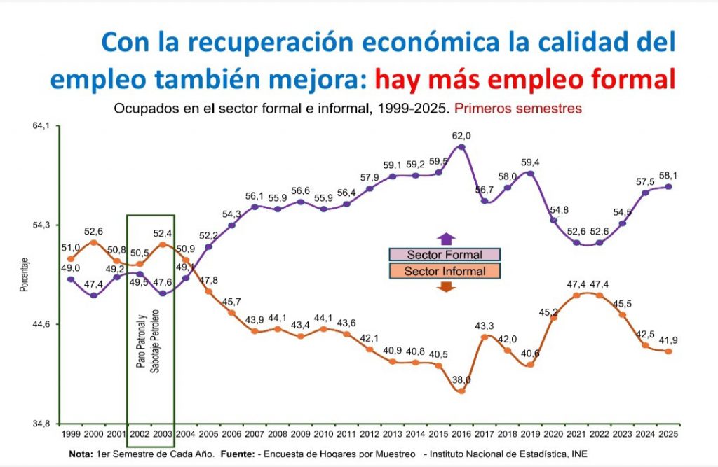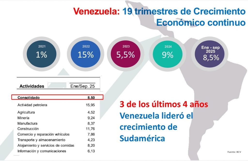 Respecto al tema, la presidenta encargada, Delcy Rodríguez, informó que Venezuela ha alcanzado un hito histórico de 19 trimestres consecutivos de crecimiento económico, lo que posiciona al país con un liderazgo regional sólido. Asimismo, indicó que en el año 2025, la economía venezolana registró un crecimiento del 8.5%.