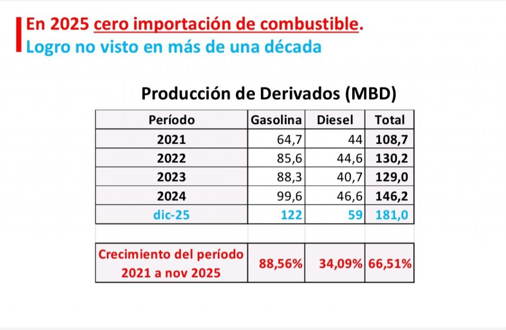 Asimismo, explicó que el país ha dejado de depender de suministros externos para el consumo interno de combustible, logrando satisfacer la demanda nacional con producción 100% propia. Rodríguez destacó que este logro es una victoria frente a las Medidas Coercitivas Unilaterales que intentaron paralizar el transporte y la economía del país mediante el corte de suministros de aditivos y repuestos.