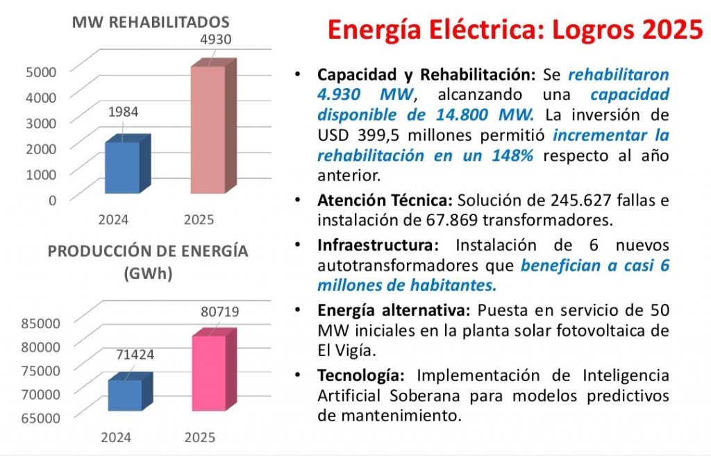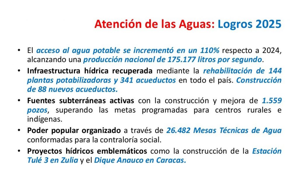 Se incorporaron al Sistema Eléctrico Nacional (SEN) 5 mil megavatios se incrementó el acceso al servicio de agua potable en 110 %, así como los proyectos del Poder Popular y Comunal.