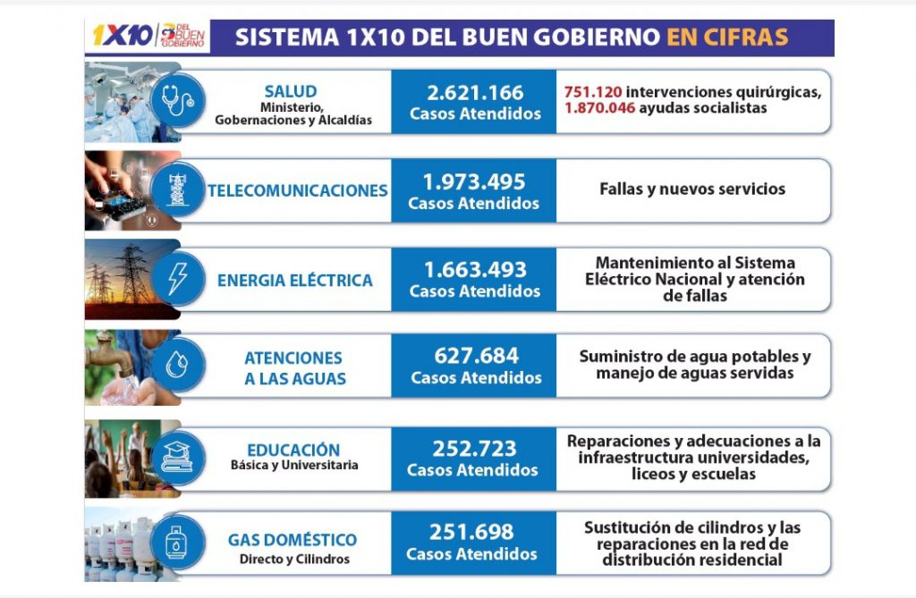 El Sistema 1×10 del Buen Gobierno alcanzó la cifra de más de 7 millones 300 mil casos resueltos en el año 2025, informó este jueves la presidenta encargada, Delcy Rodríguez, durante la presentación del Mensaje Anual a la Nación, en el que presentó los logros alcanzados bajo el mandato del presidente Nicolás Maduro Moros.