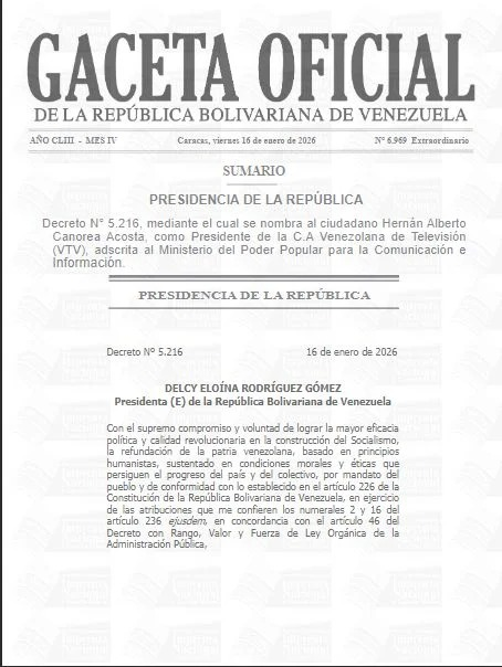 Mediante el Decreto N.º 5.216, publicado en la Gaceta Oficial N.º 6.969, el periodista Hernán Canorea ha sido designado como el nuevo presidente de Venezolana de Televisión (VTV). Canorea, un comunicador con amplia trayectoria en el sistema nacional de medios públicos, asume el liderazgo de la planta televisiva adscrita al Ministerio del Poder Popular para la Comunicación e Información. La medida entró en vigencia de forma inmediata el pasado viernes 16 de enero.