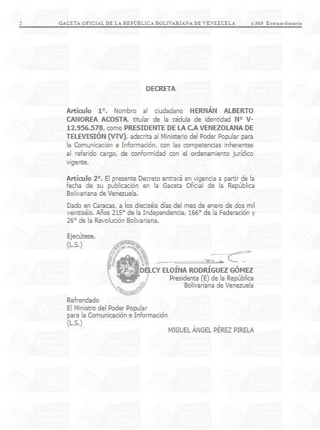 Caracas, 20 de enero del 2026. – La presidenta (E) de la República, Delcy Rodríguez, designó este martes como nuevo presidente de Venezolana de Televisión (VTV) al periodista, Hernán Canorea, y la abogada y economista, Anabel Pereira Fernández, como presidenta encargada de la Fundación Patria y presidenta del respectivo Consejo Directivo de la Fundación Patria.