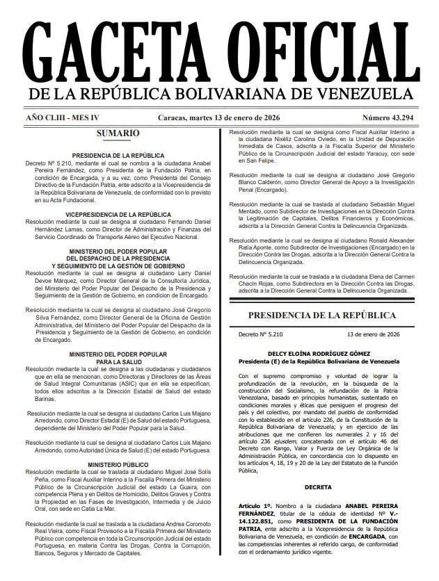 Del mismo modo, el nombramiento de la abogada y economista Anabel Pereira Fernández como presidenta encargada de la Fundación Patria y de su respectivo Consejo Directivo quedó registrado el 13 de enero en la Gaceta Oficial N° 43.294, bajo el Decreto N° 5.210.