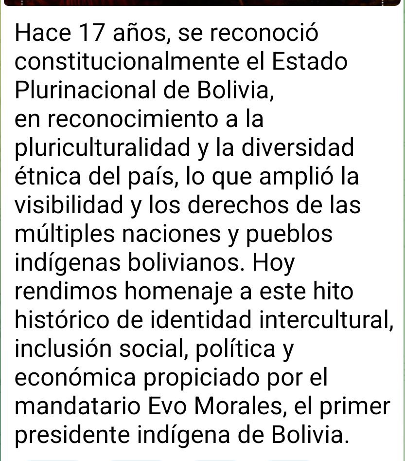 Así lo compartió el ministro del Poder Popular para las Relaciones Exteriores de Venezuela, Yván Gil, a través de sus redes sociales, destacando que: «Este hito histórico de identidad intercultural propiciado por el mandatario Evo Morales amplió la visibilidad y los derechos de las múltiples naciones y pueblos indígenas bolivianos».