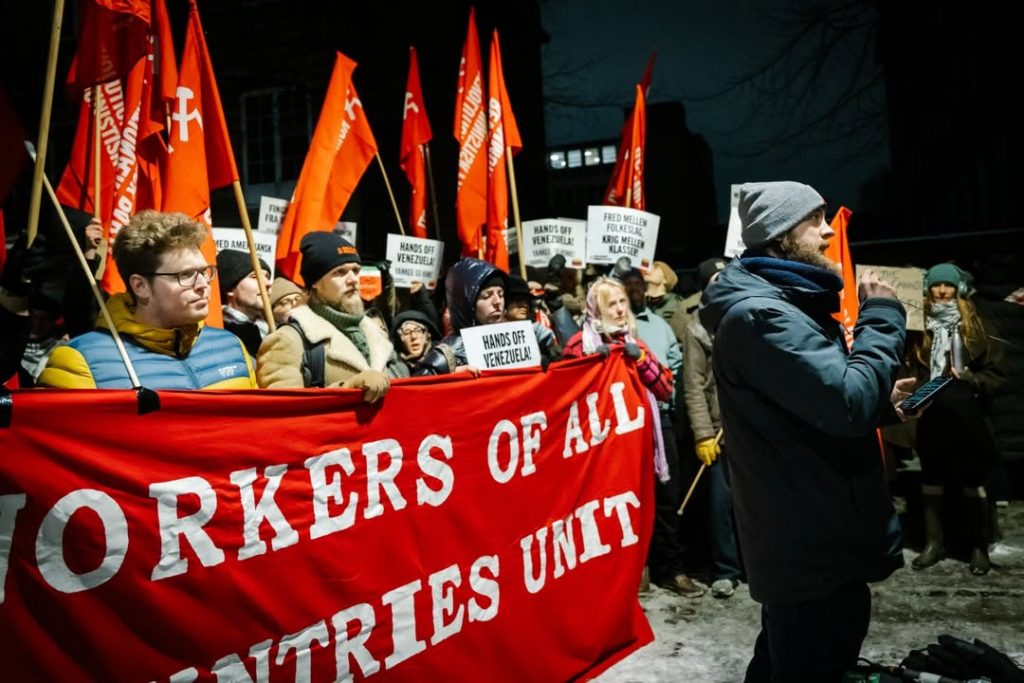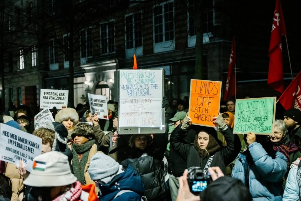 Cientos de ciudadanos se movilizaron este jueves 22 de enero por las calles de la capital danesa, en una contundente marcha que culminó frente a la embajada de los Estados Unidos. Los manifestantes alzaron su voz para exigir el cese inmediato de las agresiones contra Venezuela. Durante la jornada, se denunció enérgicamente el bombardeo perpetrado contra territorio venezolano, calificándolo como una violación flagrante del derecho internacional y un atentado contra la paz regional.