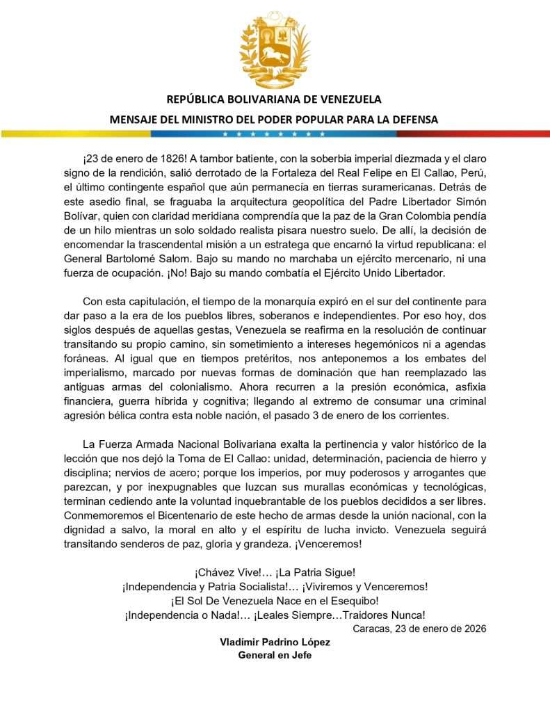 El ministro del Poder Popular para la Defensa, General en Jefe Vladimir Padrino López, emitió un comunicado oficial este 23 de enero para conmemorar el Bicentenario de la Toma del Callao.