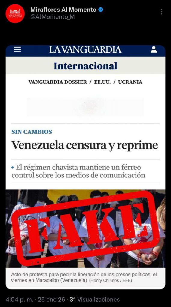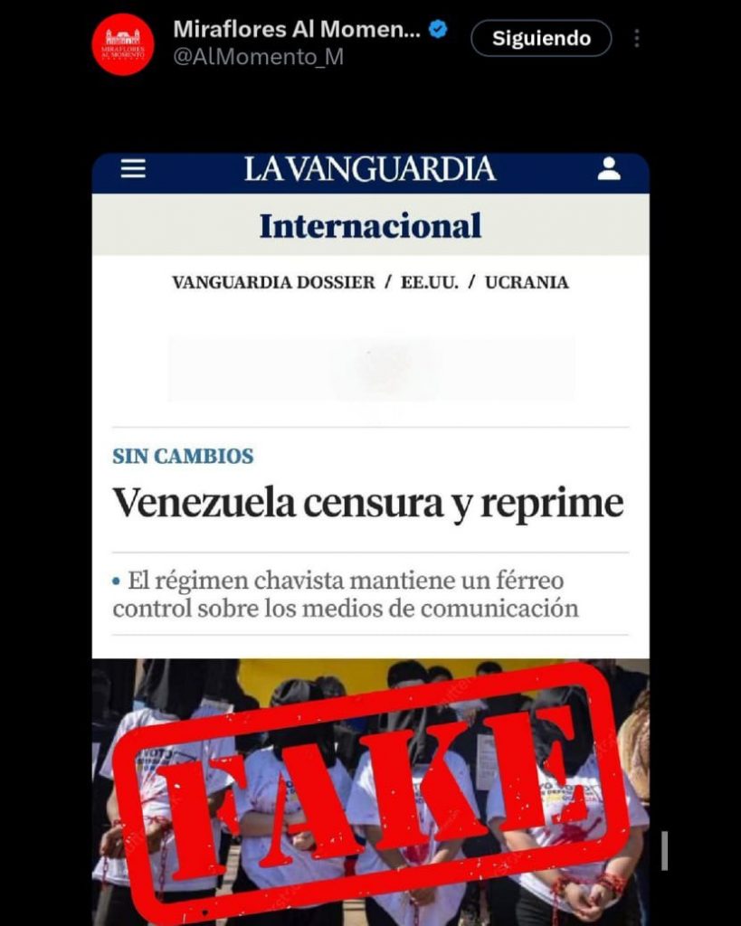 Este domingo, la cuenta X de Miraflores Al Momento (https://x.com/AlMomento_M) calificó como «FAKE» una publicación del diario español La Vanguardia, la cual aseguraba que en Venezuela existe «censura y represión».