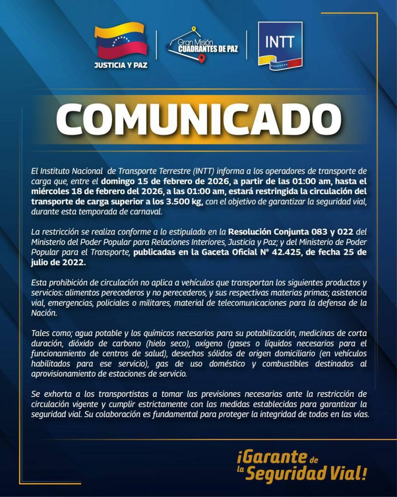 La restricción entrará en vigor a partir de las 1:00 a. m. de este domingo 15 de febrero y se extenderá hasta la misma hora del miércoles 18 de febrero de 2026. Con esta acción, el ente de transporte busca fortalecer la seguridad vial y reducir los riesgos de incidentes, permitiendo que las familias venezolanas disfruten del asueto en un entorno de mayor tranquilidad y orden en las carreteras.