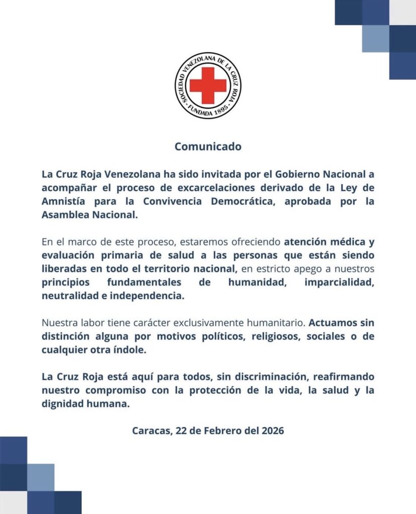 La Cruz Roja Venezolana anunció que, por invitación del Gobierno Nacional, brindará acompañamiento técnico y humanitario durante el proceso de excarcelaciones derivado de la nueva Ley de Amnistía para la Convivencia Democrática. A través de sus canales oficiales, la institución confirmó que desplegará equipos en todo el territorio nacional para ofrecer atención médica y evaluaciones primarias de salud a los ciudadanos que reciban la libertad, garantizando así un monitoreo inmediato de su bienestar físico.