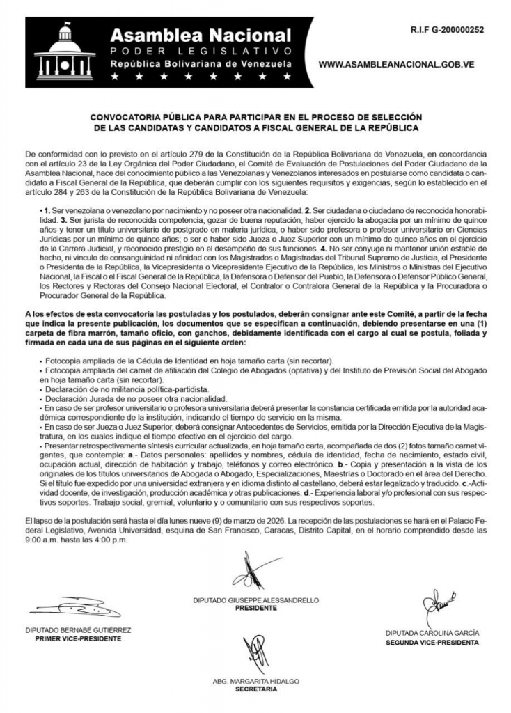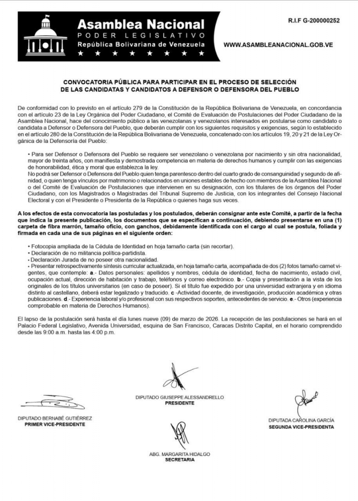 Este lunes, la Asamblea Nacional (AN) de Venezuela inició el proceso de recepción de credenciales para los aspirantes a los cargos de Fiscal General de la República y Defensor del Pueblo. Los interesados tendrán hasta el próximo 9 de marzo para consignar sus documentos ante el Comité de Postulaciones en el Palacio Federal Legislativo, en un horario de atención comprendido entre las 9:00 am y las 4:00 pm.