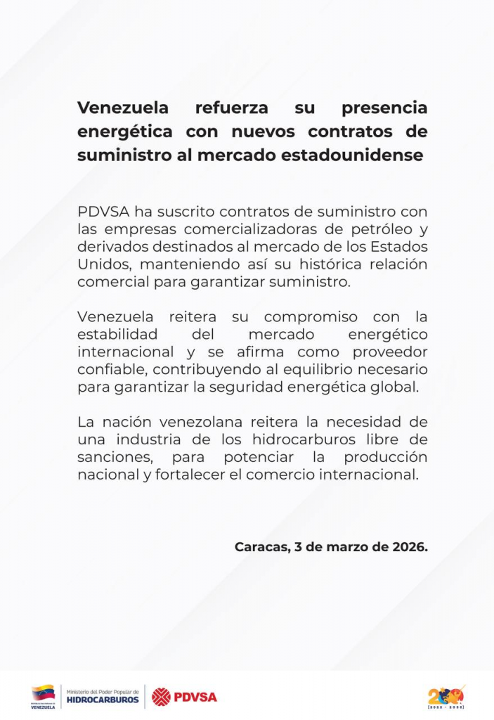 Este martes, el Ministerio del Poder Popular de Hidrocarburos emitió un comunicado oficial donde expresa que la estatal Petróleos de Venezuela S.A. (PDVSA) suscribió nuevos contratos de suministro con empresas comercializadoras para el mercado de los Estados Unidos, con el objetivo de mantener su histórica relación comercial y garantizar el flujo de hidrocarburos.