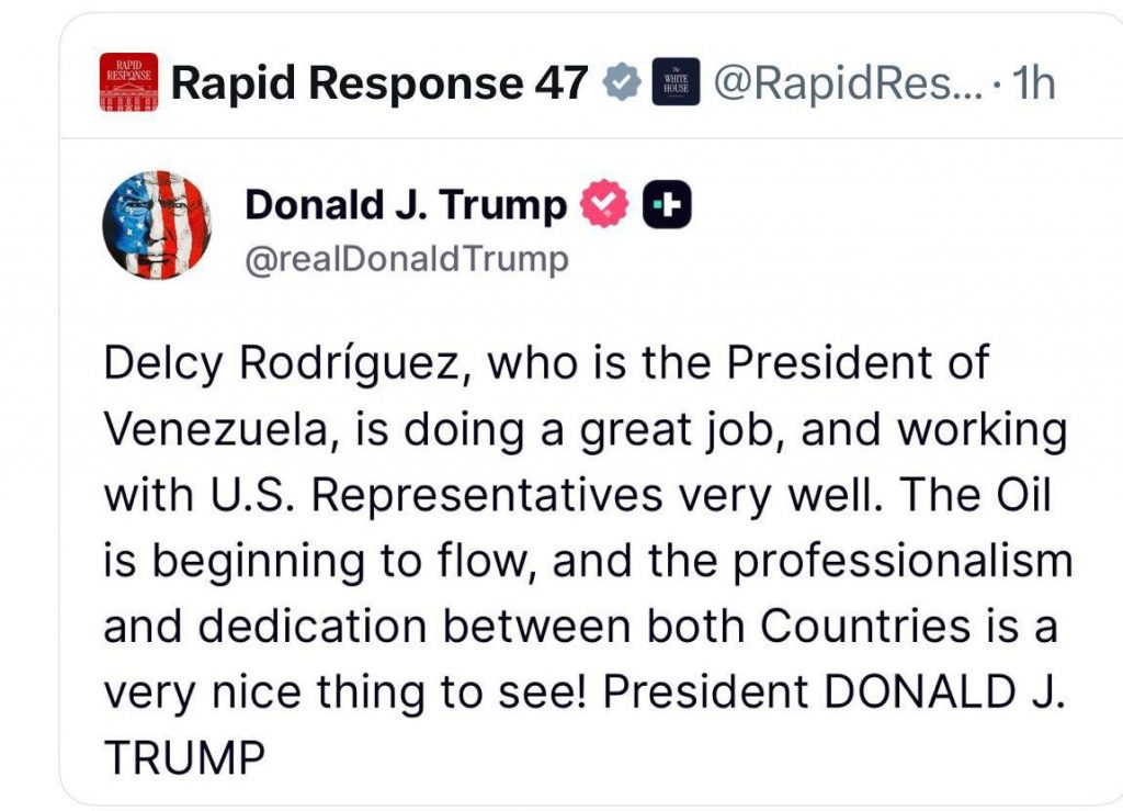 En su declaración, la Jefa de Estado (E) destacó la importancia de establecer una ruta de trabajo compartida que priorice el bienestar social y económico de ambos países. «Agradezco al presidente Donald Trump la amable disposición de su gobierno para trabajar conjuntamente en una agenda que fortalezca la cooperación binacional en beneficio de los pueblos de Estados Unidos y Venezuela», señaló la Dignataria (E).