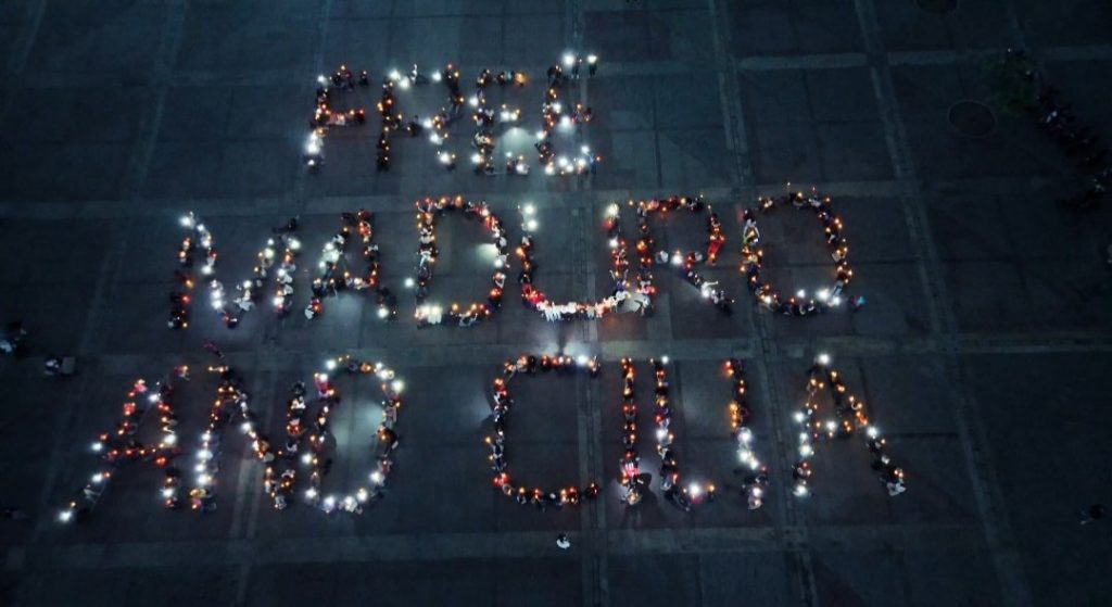 La vigilia se caracterizó por una atmósfera de solemnidad y esperanza, destacando una impresionante coreografía de luces. Los jóvenes, portando velas y lámparas, se distribuyeron estratégicamente en el suelo para formar un mensaje gigante que rezaba: «FREE MADURO AND CILIA» (Liberen a Maduro y Cilia) y con un clamor unísono de «Bring them back» (Tráiganlos de vuelta).