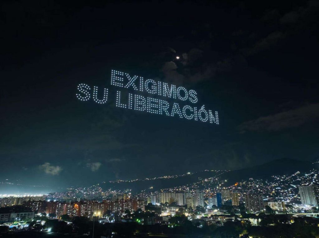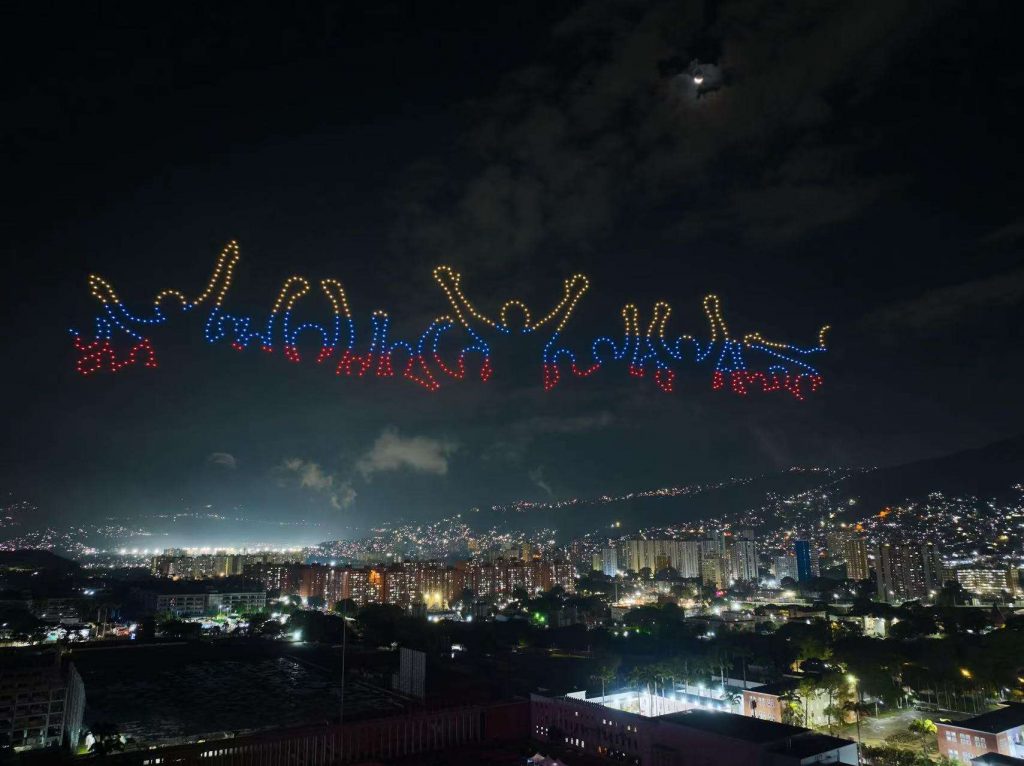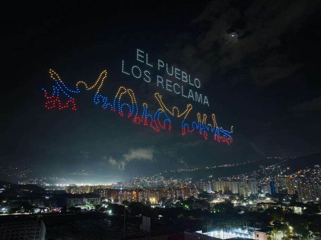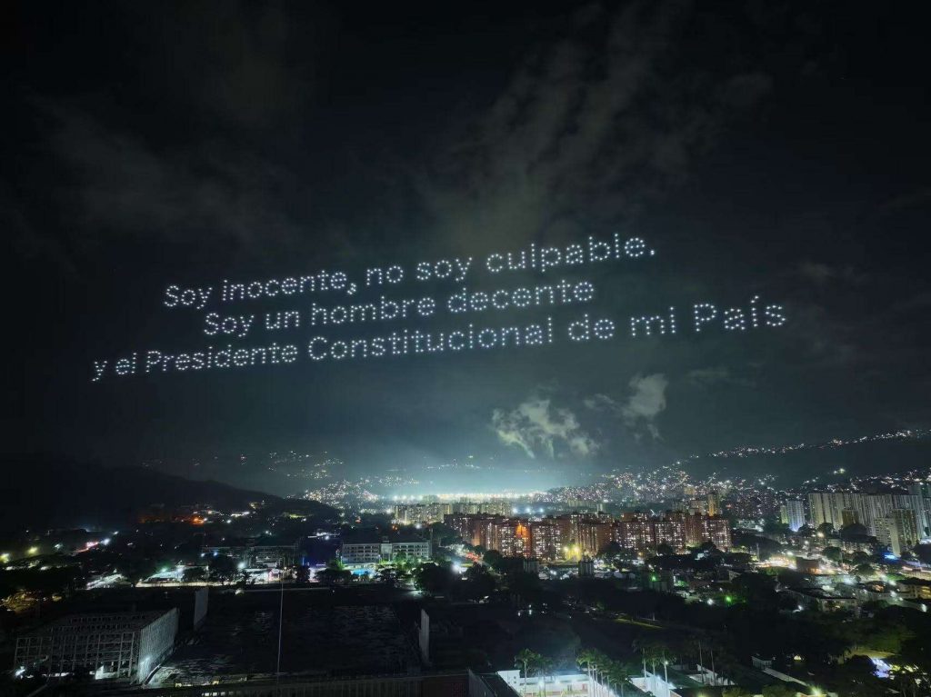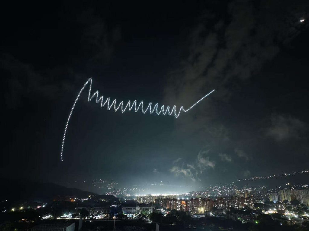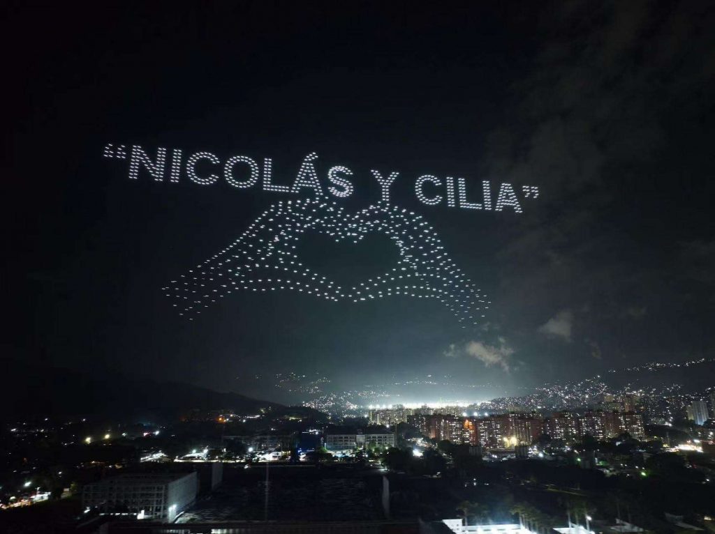 La noche de este viernes el cielo caraqueño fue el escenario de un innovador y llamativo espectáculo de drones luminosos, organizado por grupos de simpatizantes, en el que se proyectaron imágenes del presidente Constitucional de la República, Nicolás Maduro Moros, y de la primera Dama, Cilia Flores.