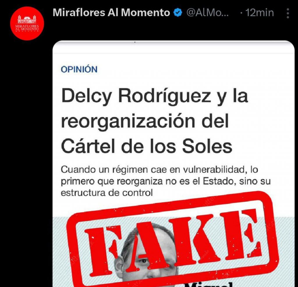 Este lunes, Miraflores al Momento denunció, a través de su cuenta oficial X, un supuesto artículo de opinión atribuido al medio Diario Las Américas, el cual vincula falsamente a la Presidenta (E), Delcy Rodríguez, con estructuras delictivas.