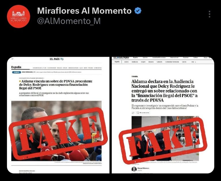 La cuenta oficial informativa «Miraflores al Momento» desmintió de manera categórica una publicación dos diarios españoles la cual difundían acusaciones falsas sobre una supuesta entrega de financiamiento ilegal mediante la industria PDVSA por parte de la presidenta (E) Delcy Rodríguez.