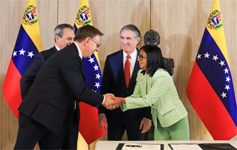 En el contexto de la firma de nuevos acuerdos estratégicos con Shell en materia de Hidrocarburos, la Presidenta (E), Delcy Rodríguez, expresó la voluntad de Venezuela de mantener una agenda diplomática de paz y cooperación económica.