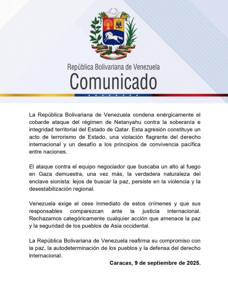 Caracas, 9 de septiembre de 2025. La República Bolivariana de Venezuela rechazó con firmeza el asalto del régimen de Netanyahu a la soberanía e integridad territorial del Estado de Qatar.