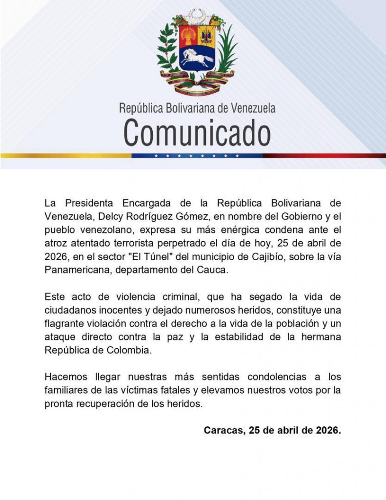El Gobierno de la República Bolivariana de Venezuela, a través de un comunicado difundido por el canciller Yván Gil, expresó su más firme condena al atroz atentado terrorista ocurrido este 25 de abril de 2026 en el sector «El Túnel» del municipio de Cajibío, Colombia. En nombre de la Presidenta (E), Delcy Rodríguez, y del pueblo venezolano, el Ejecutivo Nacional manifestó su rechazo a este acto violento perpetrado en la vía Panamericana del departamento del Cauca.