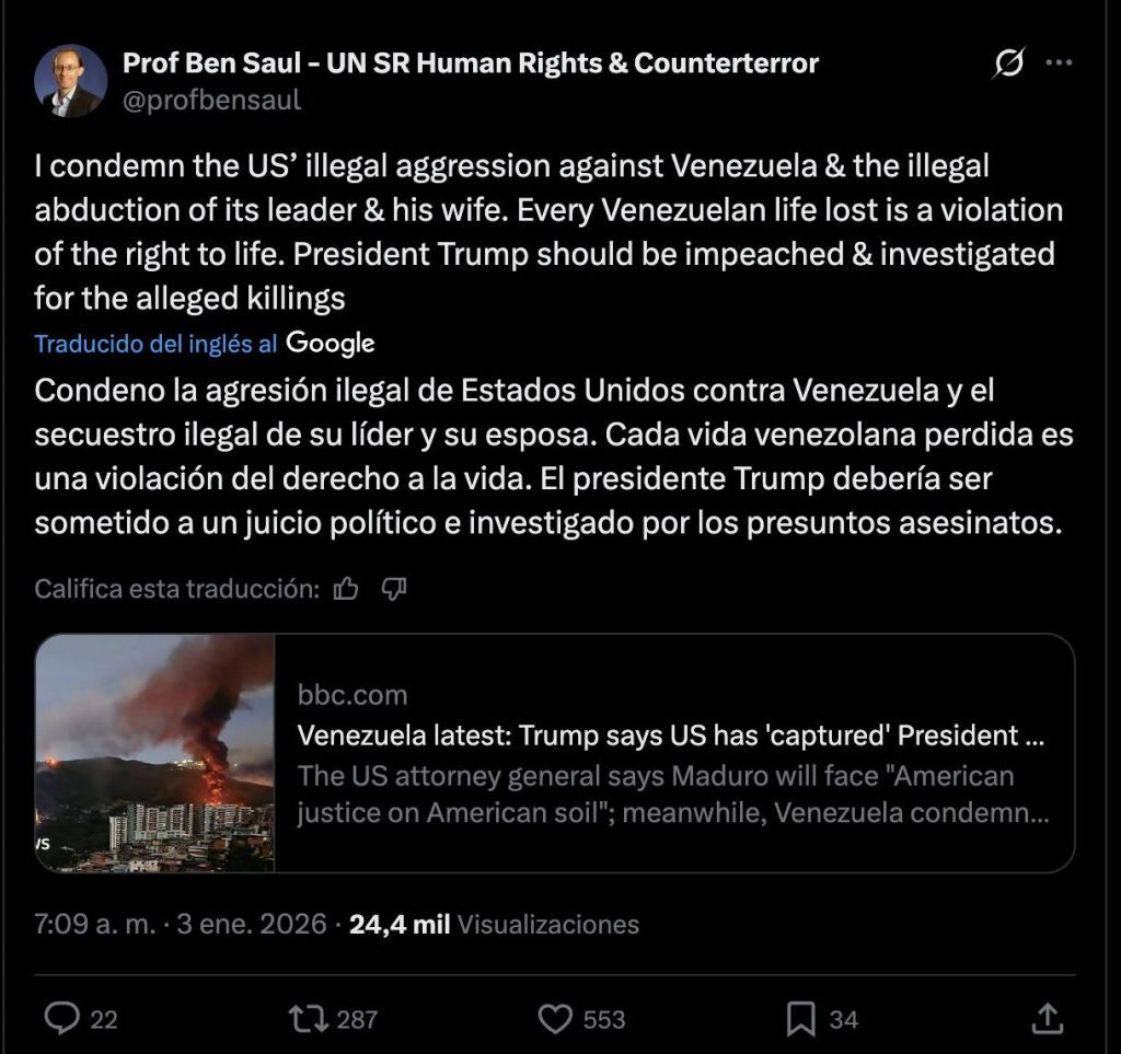 Gil calificó como «contundente» el mensaje del Relator, quien denunció el secuestro ilegal del presidente Constitucional, Nicolás Maduro, y la primera Combatiente, Cilia Flores, además de los bombardeos ejecutados contra el territorio nacional. El Canciller enfatizó que estos actos representan una violación flagrante a las normas internacionales.
