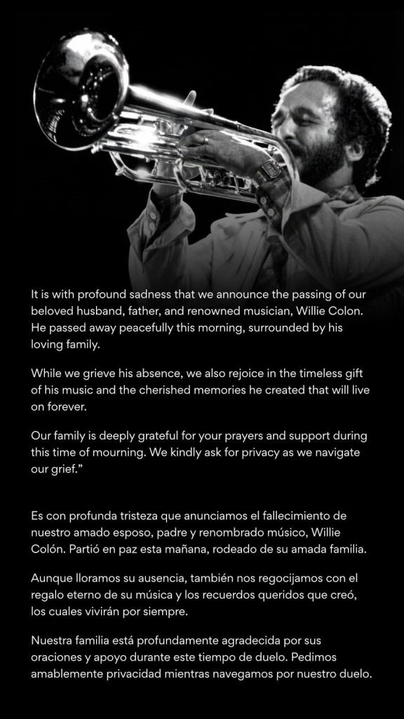 Como pionero del sonido de la «Fania» y colaborador clave de voces icónicas, Colón no solo fue un músico excepcional, sino un cronista de la vida urbana que definió la identidad sonora de toda una generación. «Con profunda tristeza anunciamos el fallecimiento de nuestro amado esposo, padre y renombrado músico, Willie Colón. Falleció en paz esta mañana, rodeado de su querida familia», señala el comunicado oficial.